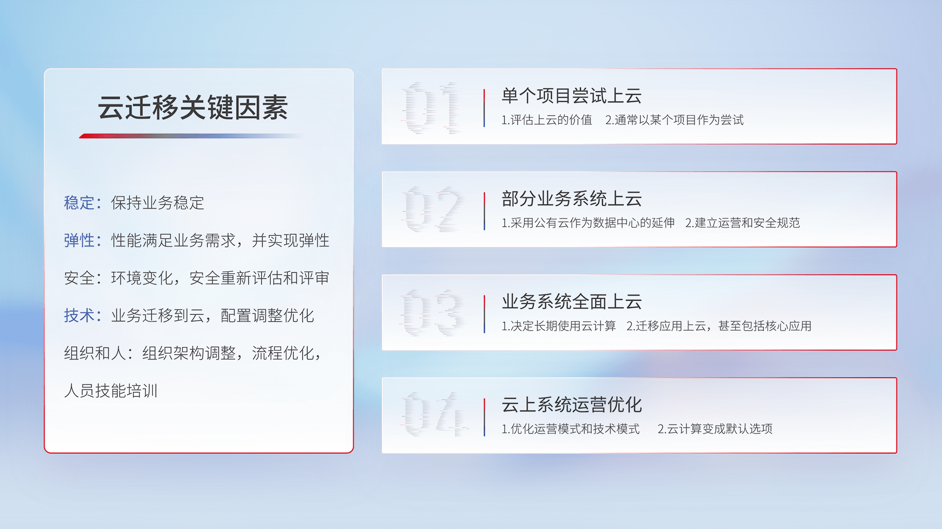结合实际业务,,,,从规划设计、、、、云平台选型、、云原生改造、、数据迁移、、、集成交付,,,,迁移全过程为客户识别最佳上云路径,,,,做好风险识别管理,,设计网络架构、、、身份权限、、、安全审计合规、、、操作审计、、日志审计、、监控告警策略、、、、多站点容灾设计等,,对云上基础设施进行整体规划,,提升IT治理水平,,,,以满足弹性、、高可用、、、、高性能的需求。。。。