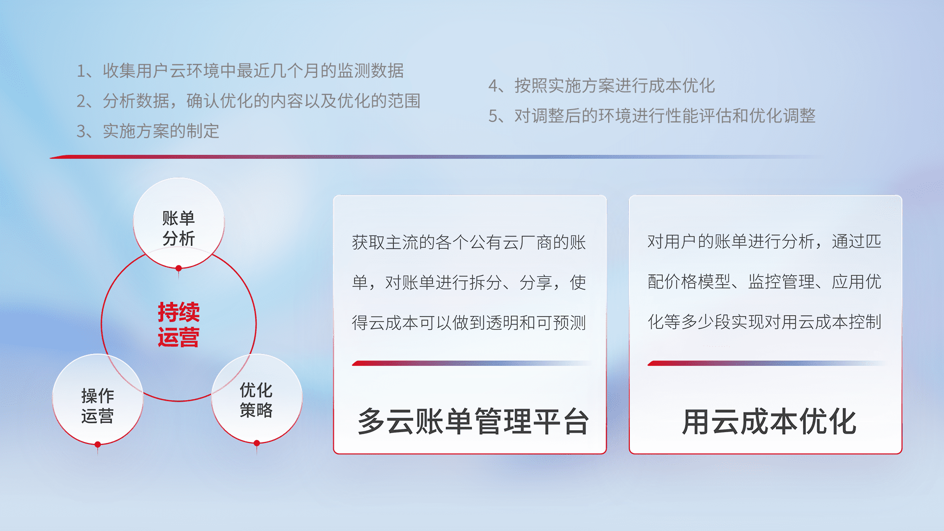 通过多云纳管,,,,以统一的资源数据模型把客户的云资源进行抽象和封装,,,进而实现对多云资源的统一操作,,保障云资源管理的可靠性、、、稳定性与可用性。。。量身定制化运维内容,,配置、、开发运维、、、、补丁管理、、、备份、、、监控、、认证和访问管理、、、、审计和日常巡检等,,,保障在用云过程中的可靠度,,,稳定度以及高可用率。。。